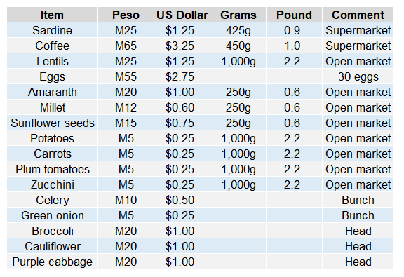 Peanut butter is extremely limited here; there is no “real” peanut butter, only “fake” peanut butter with hydrogenated oils; often $5 USD for small jar; representative food prices below.