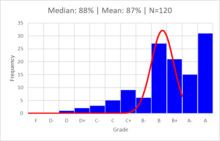 Based on student behavior, it appears that many students wanted a diploma, not an education. There was also a certain amount of grade inflation; as I was advised that the average course grade should be a “B” (84%).