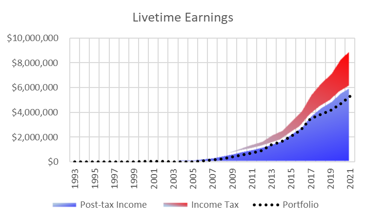 I track my lifetime earnings; saved 58% of every dollar, 32% paid to income taxes, and lived off 10%, noted in the chart below. I worked five years in Houston TX as CFO, for a private-equity firm; part of my compensation was carried interest, as part of each investment fund. I was required to co-invest with the limited partners, in what is a ten-year, illiquid investment. I anticipate another five years of carried interest distributions which contribute to my portfolio’s capital appreciation; about 5% of my net worth is tied-up in the co-investment. The chart below does not include my earned carried interest accrual; in this case, the income is earned, credited to my partnership account, taxed by the IRS, but not yet distributed in cash. When the cash distribution is subsequently made, the event is non-taxable.