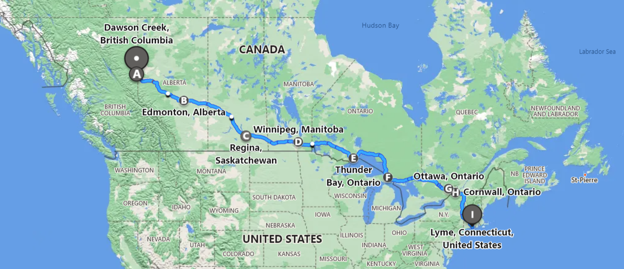 Should note that driving across Canada, that the highway does not resemble the interstate highway in the lower 48; it’s often a two-lane undivided highway, with many tractor trailers. There are few rest stops, and few gas stations, so it’s important to invoke the half-tank rule. The drive is tiring; 5,000-miles from Alaska to Connecticut, averaging 400-miles per day.